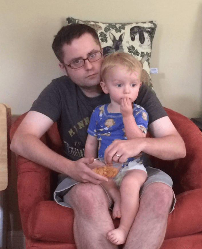 Solomon and I are sitting in Katie’s parents’ living room in this picture. It’s about a month before we would leave Minneapolis for the wilds of Central Pennsylvania. So this would have been June of 2015, maybe? I was thirty-five. Solomon was one.