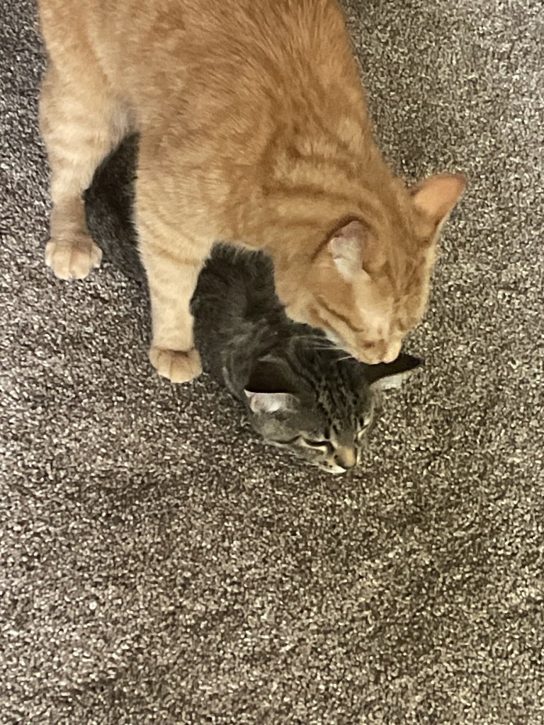 Theo, our beloved orange tabby, appeared to be mounting his little sister.
