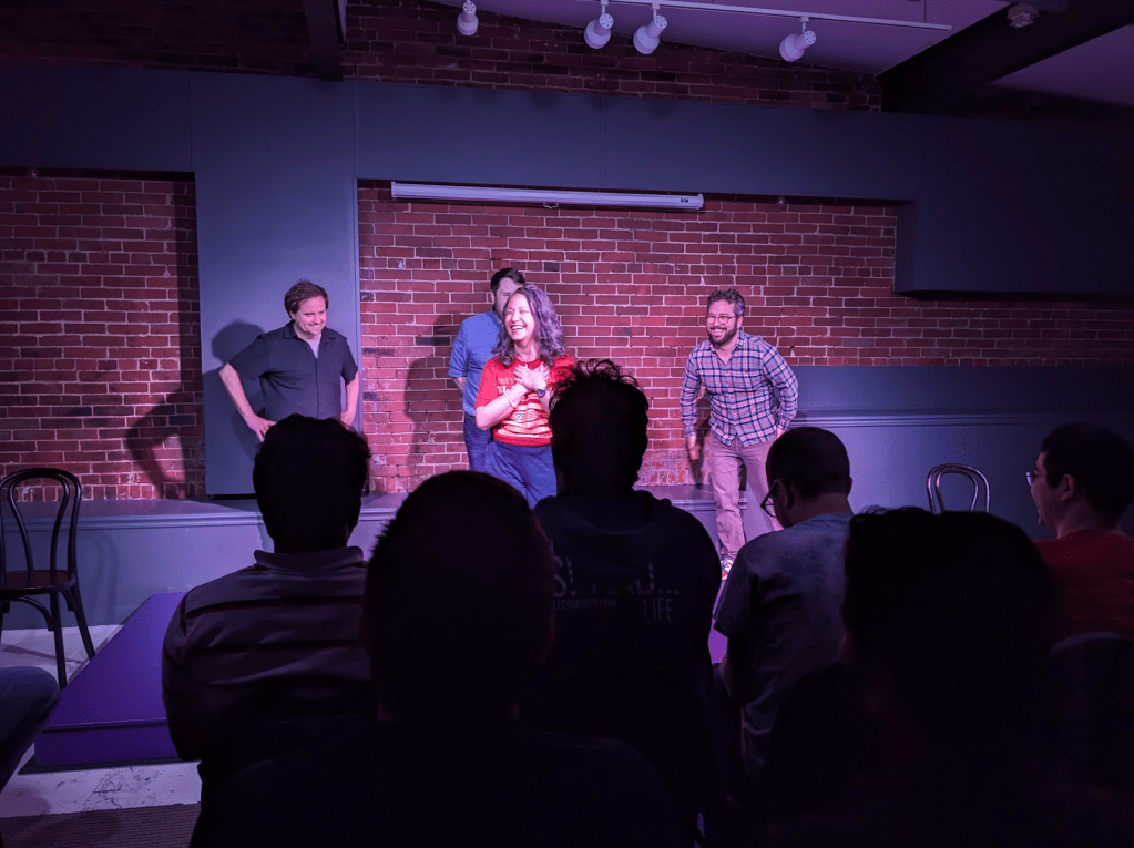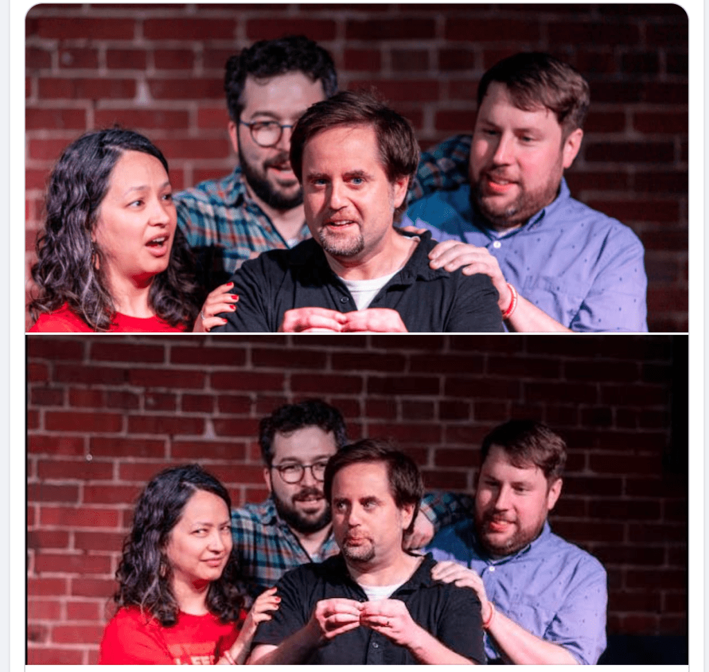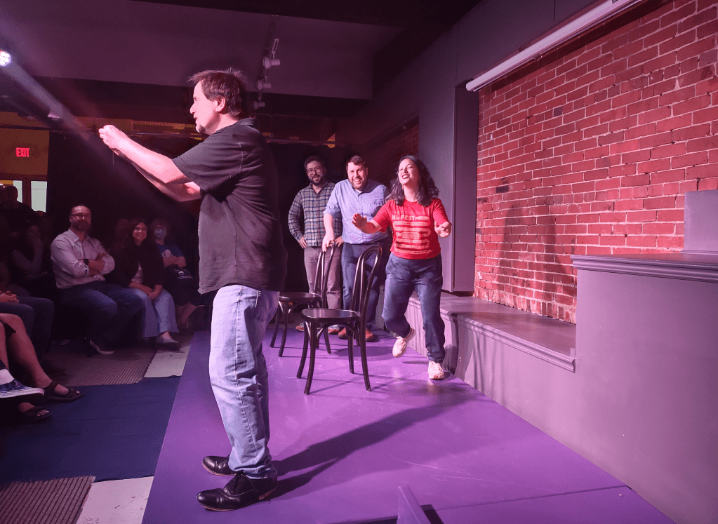 There I am with Andrea, James, and Nate. The four of us founded an improv theatre company in State College in 2017. Opened the Blue Brick Theatre in 2021. Happy Valley Improv held its third annual XL Improv Festival a few weeks ago. Look at all those links! I returned, in part, to perform with the other founders. It has been 2 years since our group Alone in a Church performed a set. Above, you see the four of us about to do some improv. Below, you see the four of us doing improv: