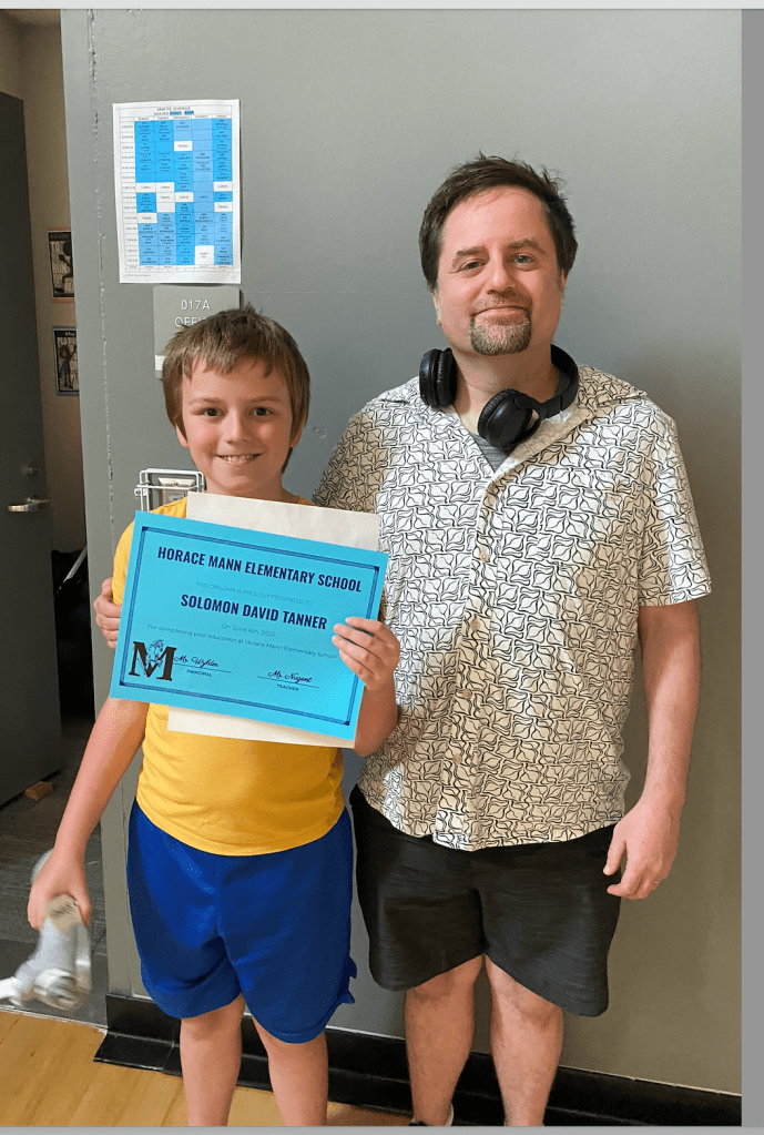 At first, I didn’t like the picture at this top of this blog. Solomon and I standing together at his 5th grade graduation ceremony in the gym at Horace Mann Elementary in Iowa City. My sideburns are gray. There are wrinkles at the corner of my eyes. I am not as slender as I remember myself. Not as tall as I pretend I am. Not as muscular. Not as Brad-Pitt-ish.