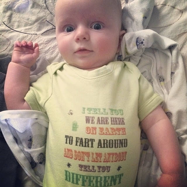 Here is a picture of the onesie that Natalie gave Solomon when he was born. It is as beautiful to me as the picture of that wild man above. A wonderful echo that just keeps echoing.