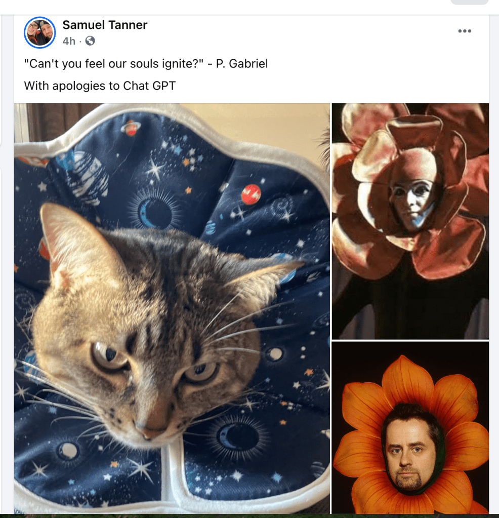 I’ve never used ChatGPT. I’m a big believer that the things we make are important because we make them. Still, I logged into ChatGPT, uploaded a picture of myself from a decade ago, and asked it to put me in Peter Gabriel’s flower costume.