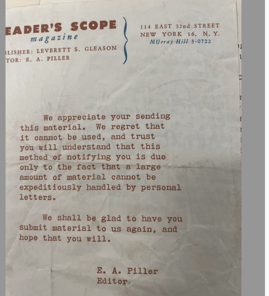 Next to the copy of Breakfast of Champions was a pile of rejection letters. Vonnegut kept all of them. There were lots of them. I’ve received enough rejection letters -well, emails – to respect Vonnegut’s collection of disappointments. Messages like these are more familiar than I would like: