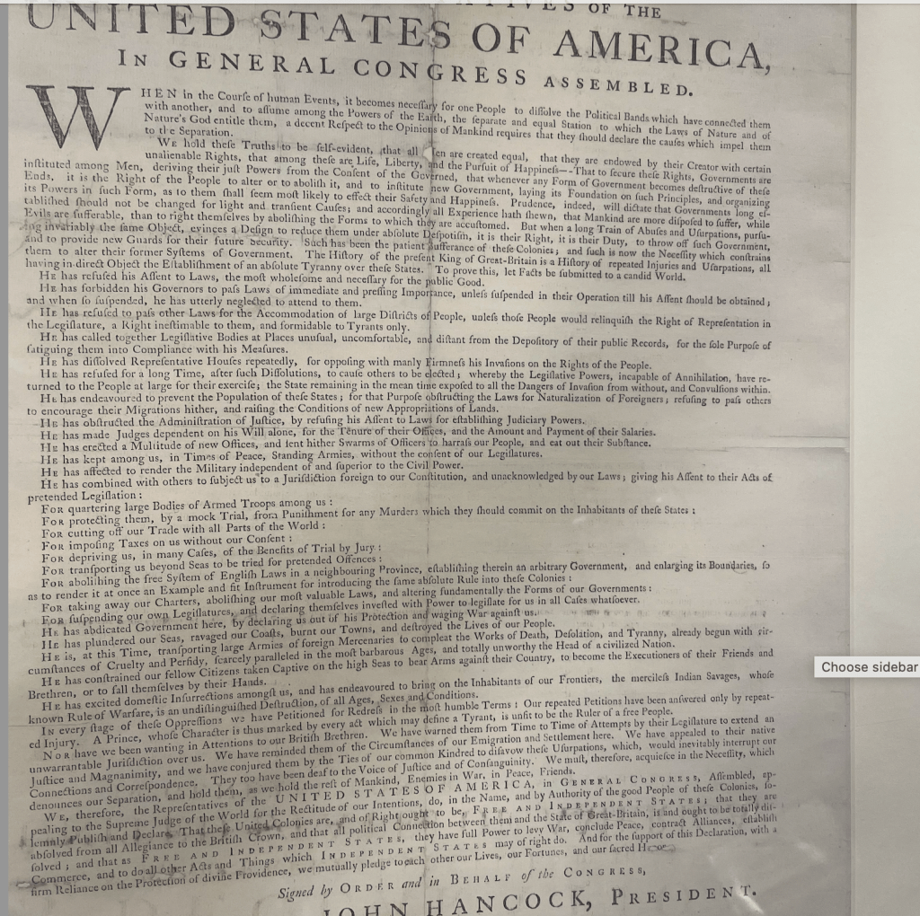 The librarian showed us at an Atlas from the 15th century. We looked at a prayer book from the 14th century. Here’s a picture of one of the 26 original copies of the Declaration of Independence printed the night after it was declared: